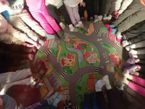 Realizamos no nosso Jardim de Infância a atividade “O mais Original Laço Azul Humano, integrado nas atividades do mês de abril, Mês para a Prevenção